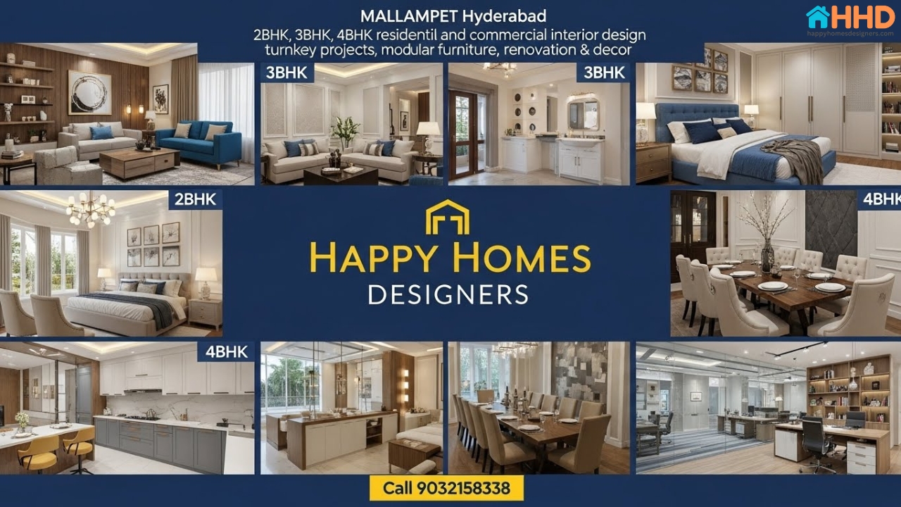 Happy Homes Designers is a trusted and professional interior design and decoration company in Mallampet, Hyderabad, specializing in 2BHK, 3BHK, and 4BHK home interiors. We create stylish, functional, and budget-friendly interiors that perfectly match your lifestyle and space requirements.